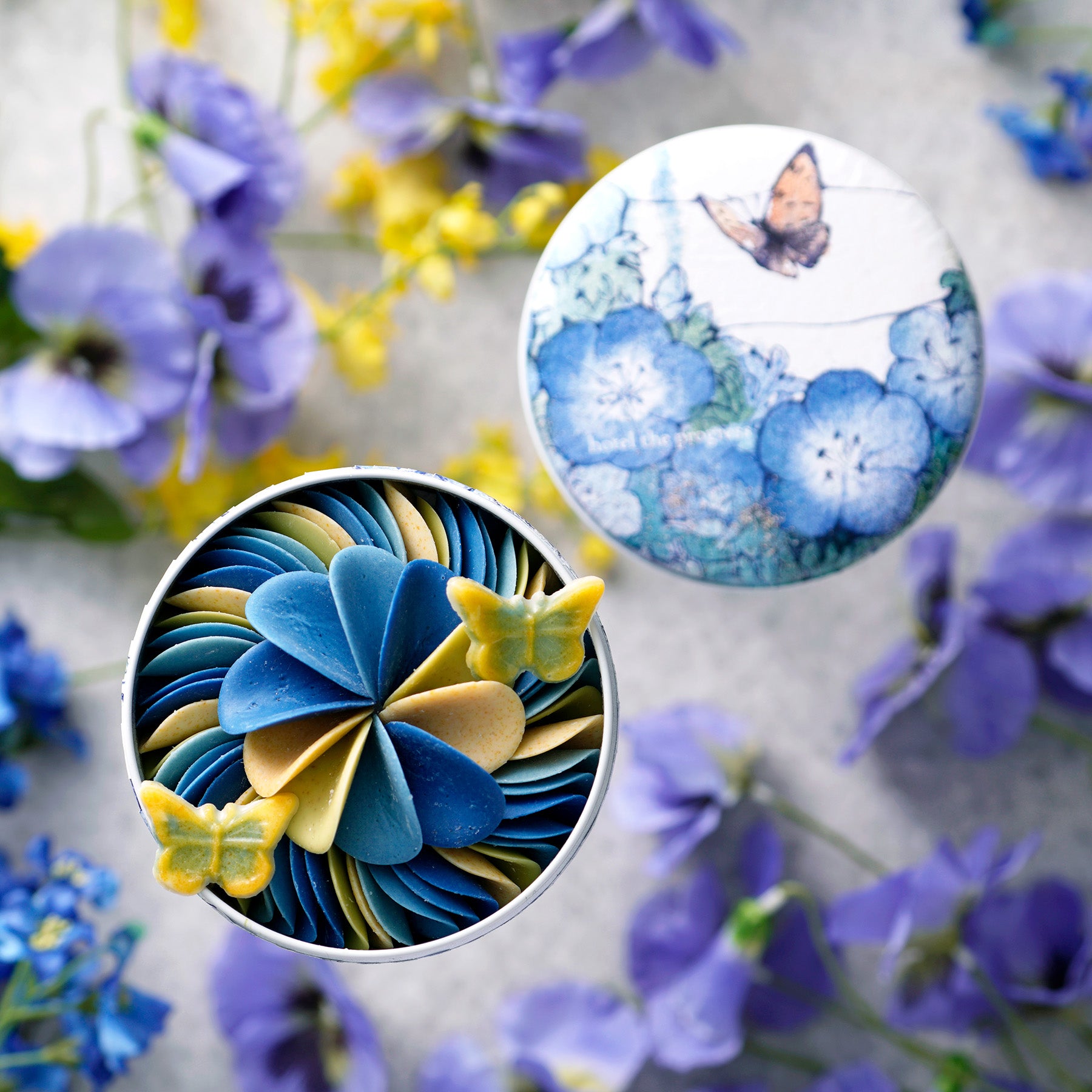 花弁にとまる蝶が、可憐で楽しげな情景を思わせます。蓋を開けた瞬間に広がる、空色の彩りと香りをお楽しみください。
