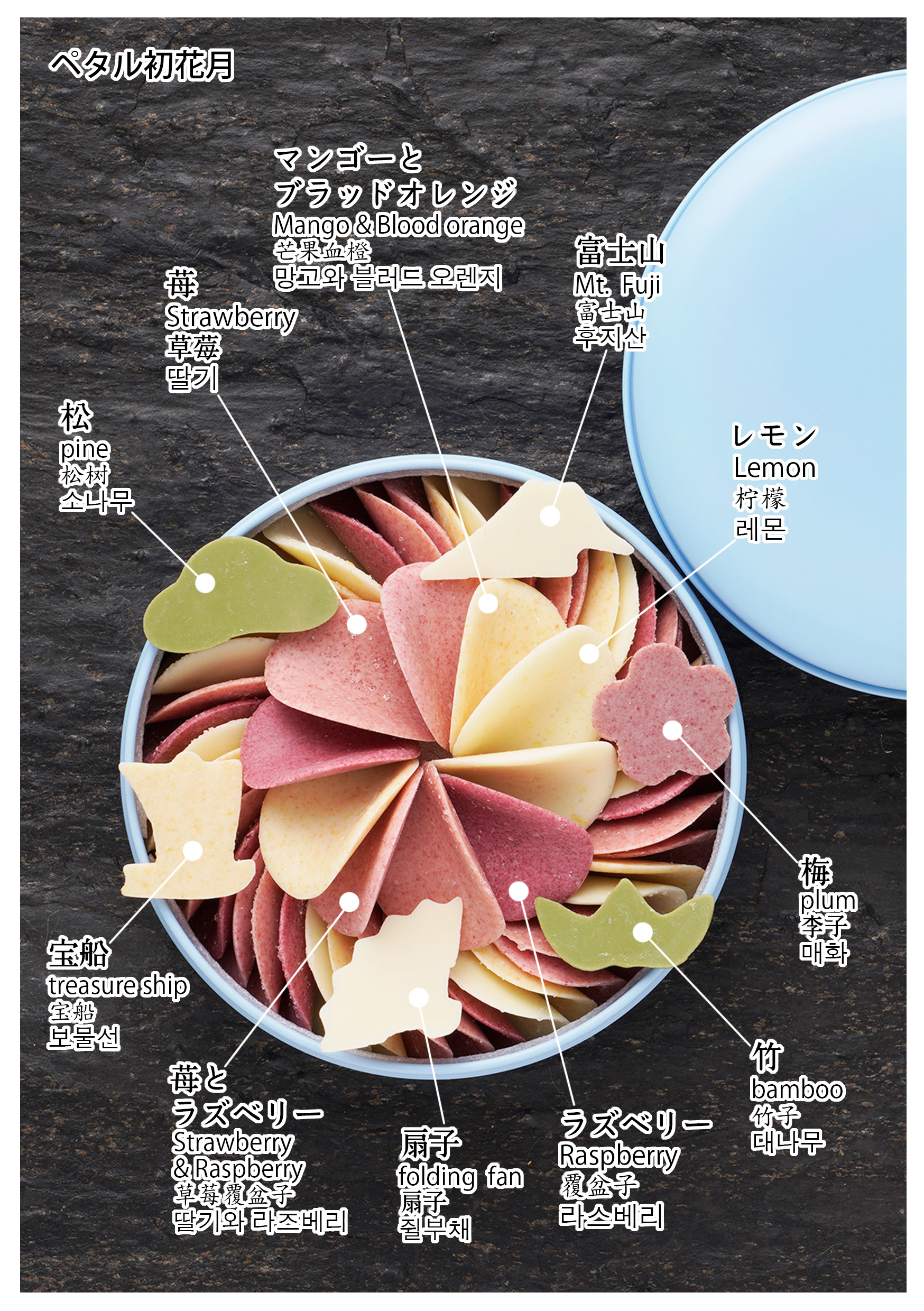 大人気のペタルシリーズから、日本のお正月をテーマにした季節限定の特別なチョコレートが登場。富士山、松竹梅といった縁起物をモチーフに、吹寄せ風の美しいデザインに仕上げました。淡い配色のペタルは、身体に優しい素材にこだわり合成着色料を使用しない素材本来の優しい色合いです。独自の特許製法により本物の花びらのように薄く仕上げたペタルチョコレートは、パリっとした食感と口の中に入れた瞬間から優しい口どけで素材本来の美味しさと香りをご堪能いただけます。
