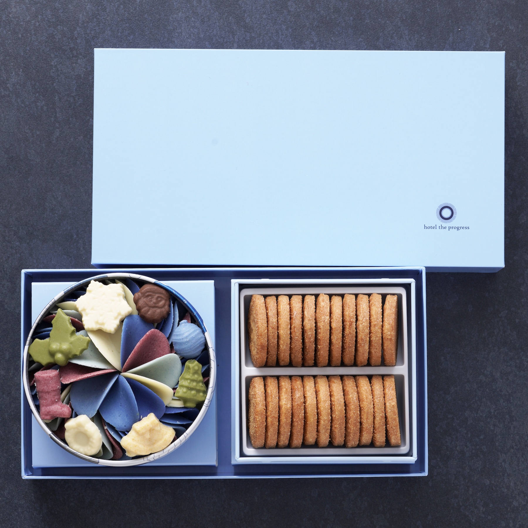 聖夜を祝うための特別な6種類(ブラッドオレンジ、ラベンダー、塩、木苺、レモン、甘夏)の花弁のチョコレートです。
