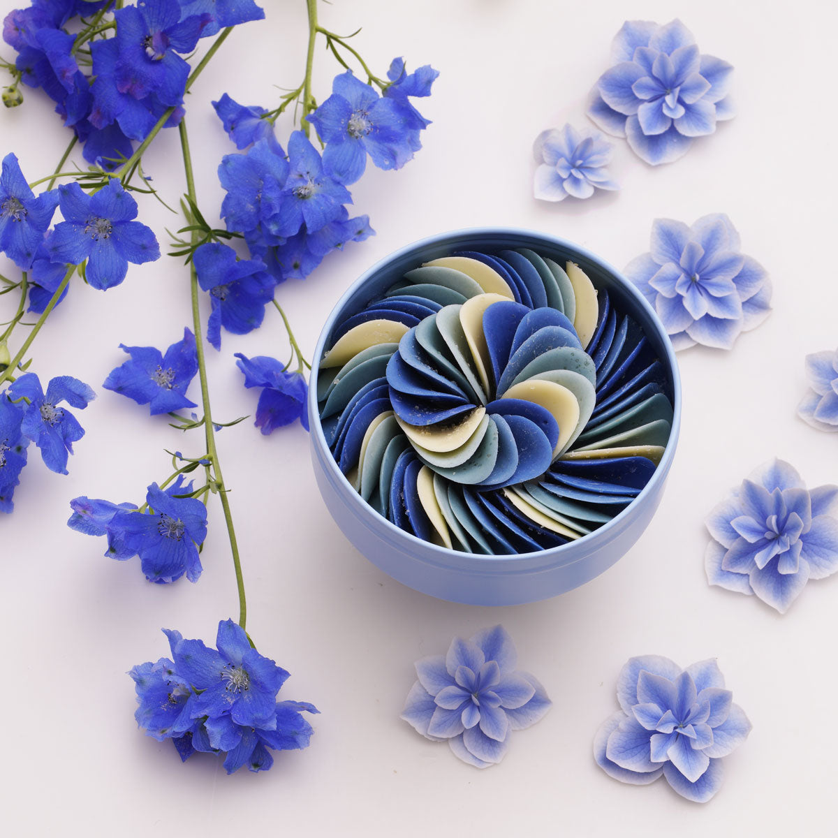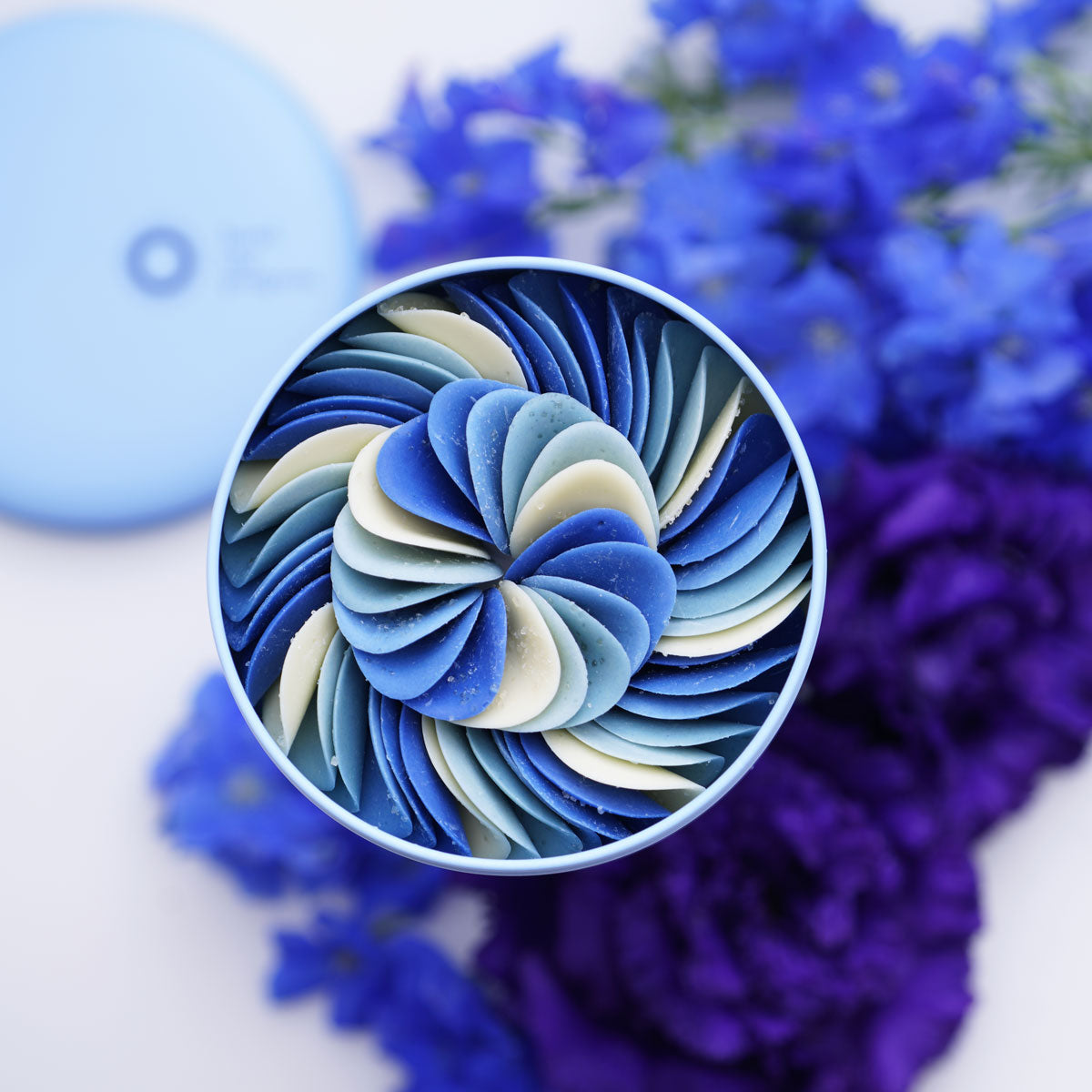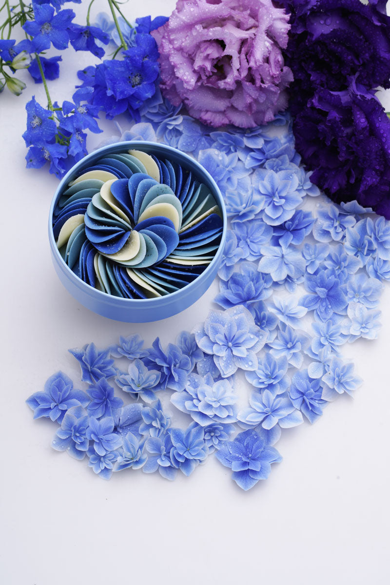 インディゴブルーの花びらが舞う、見た目にも美しいペタルチョコレート。