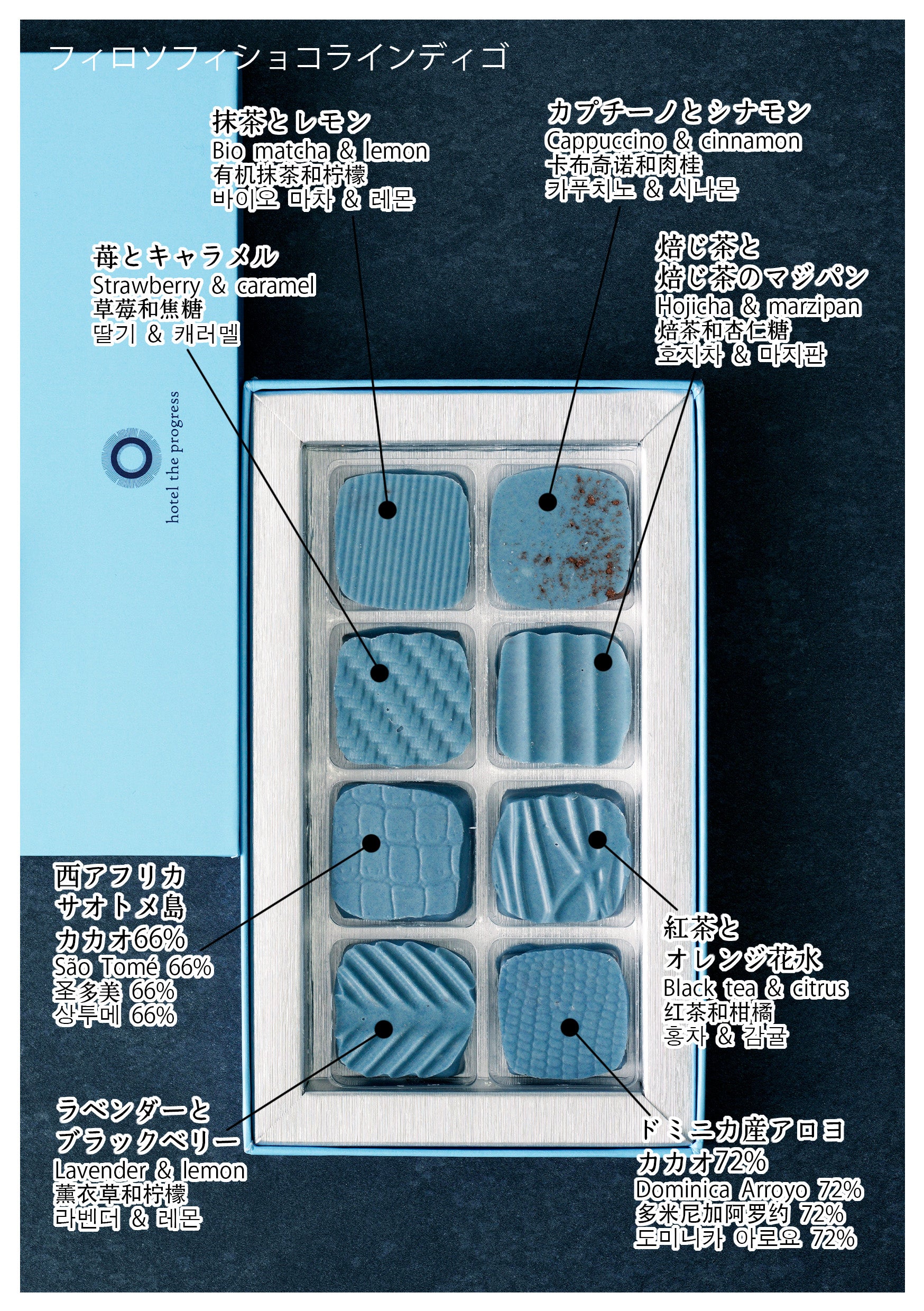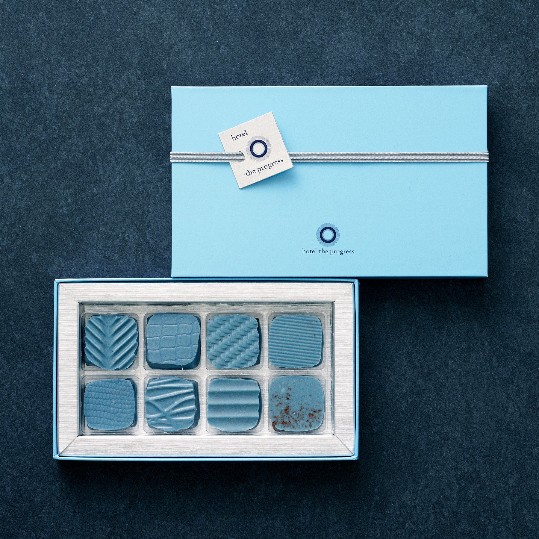hotel the progressの象徴とも言える藍色からインスピレーションを受けた、新たなチョコレートの哲学が誕生しました。シャープで鮮やかな水色に包まれた、さまざまなチョコレートの魅惑的な表情をぜひお楽しみください。植物性素材を中心に作られた、革新的なプラントベース・ボンボンショコラ。サステナブルで健康的な選択肢を提供するこの新しい形のショコラは、環境と身体の未来を見据えた一歩となっています。その一口が、これまでにない味覚の革命を体験する第一歩となるでしょう。この世界初の感動をお楽しみください。